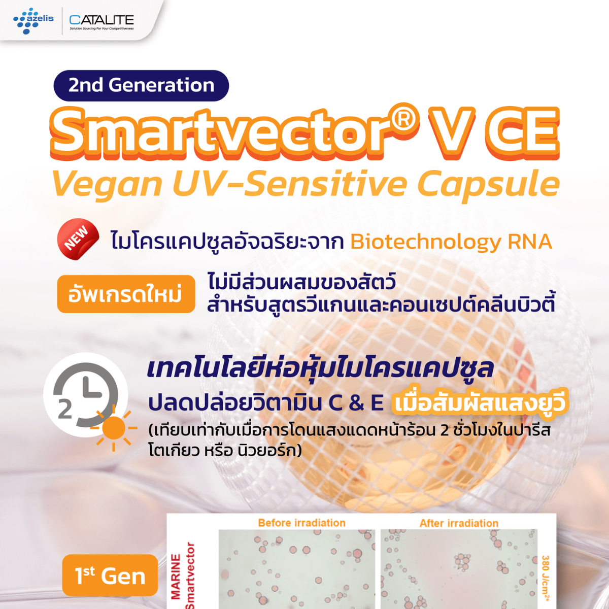 Product Descriptionเทคโนโลยีเอนแคปซูเลชันอัจฉริยะขนาดไมโคร (10-90 µm) ที่ออกแบบให้ปลดปล่อยสารสำคัญเมื่อโดนแสงยูวี พัฒนาการห่อหุ้มโดยการใช้ Biotechnolo