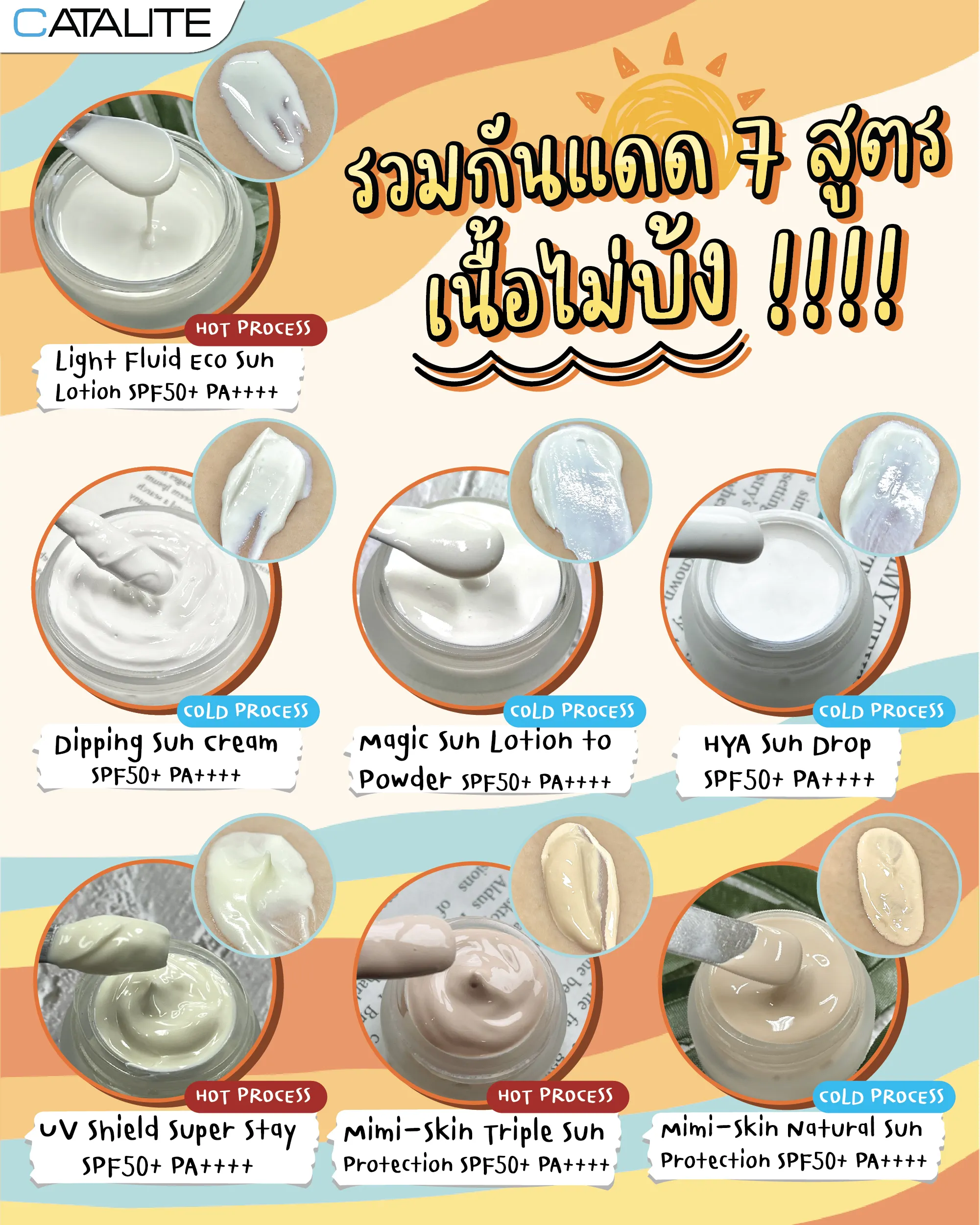 ยังคง concept 3 ตัวจบ ง่ายๆ มีให้เลือกทั้งแบบ Hot Process และ Cold Process เอาที่สบายใจ วัตถุดิบครบทั้งสูตร ราคาน่าตำ กำไรงามๆ รวมมาให้แล้วที่นี่ 7 สูตร เน้นๆ กันแดดเนื้อเซรั่มไฮยา, เนื้อแป้ง, เนื้อครีมเจลบางเบา, กันแดดหายใจได้ ไม่อุดตัน, เนื้อ primer สำหรับผิวมัน ผิวเป็นสิวง่าย หน้าไม่มัน, กันแดดโทนอัพ หน้าผ่อง หน้าเงา ผิวใส